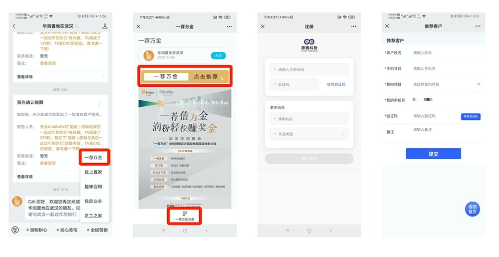 营销进入数字化时代,需要突破传统地产营销的障碍,把原来房地产高成本拓客,低效转化的局面扭转,让所有渠道与老客户积极拓客,融合线上线下资源,统筹所有营销数据,为市场扩张提速。此次,武汉华润8个项目参与数字化营销平台建设,线上线下多维度多场景的增粉拓客+社交营销传播,仅仅几个月为武汉华润城市平台服务号带来23000+粉丝,2.3万人次转发,超5万条销售线索,还有300+留电。同时在我司「全民营销2.0」的赋能下,全民营销经纪人注册近3000人,累计推荐客户近4000组。