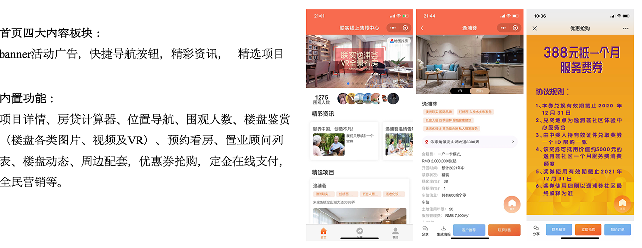 运营管理着70多个养老社区的跨国集团联实对外发声及提供服务的关键渠道是联实官方微信号,它对于加强客户和公司之间、各服务人员与客户之间的联系沟通非常关键,对于联实的品牌建设也有着重大价值,故原圈科技通过移动互联技术和智能化手段完成纽带连接和产品展示功能,为联实提供了“一站式客户体验中心”,涵盖营销推广、销售管理、签约服务、交付管理、业务服务、全民营销、案场管理、人脸识别、案场机器人、公域投放等模块。