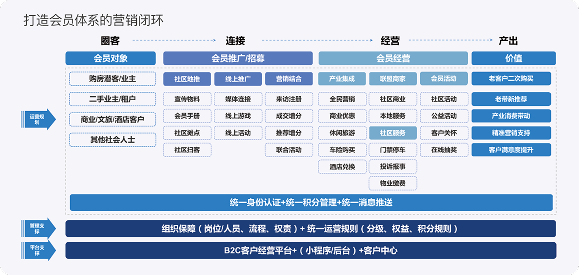 一站式会员管理体系平台支撑 + 管理支撑 助力房企沉淀客户资产,打造会员体系运营闭环。